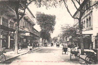CHINE - COCHINCHINE Une carte postale de Saïgon, Cochinchine, Viet Nam, en 1920. Ici l'on voit la rue Catinat près du théâtre. Voici le lien d'une photo de la même rue avec le même point de vue mais prise à un autre moment.